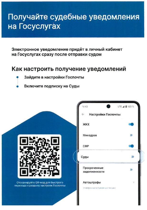 Электронное уведомление приходит в личный кабинет на Госуслугах сразу после отправки судом. Настроить получение уведомлений можно, зайдя в настройки Госпочты и включив подписку на суды.